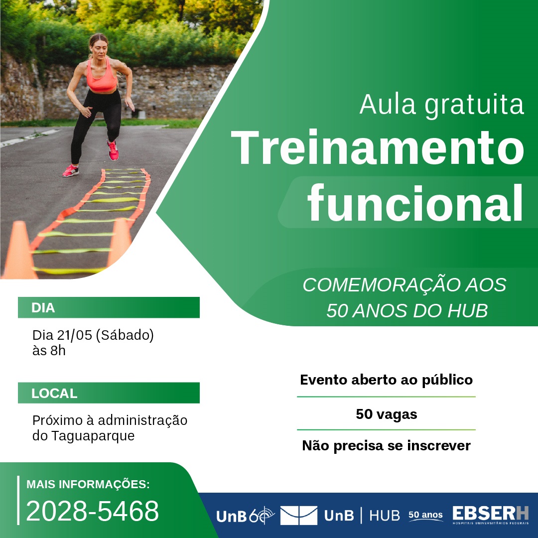 No dia 21 de maio, o Hospital Universitário de Brasília (HUB-UnB) realiza uma aula de treinamento funcional no Taguaparque, localizado em Taguatinga. A iniciativa é gratuita e direcionada a toda a comunidade do Distrito Federal, sem necessidade de se inscrever previamente.